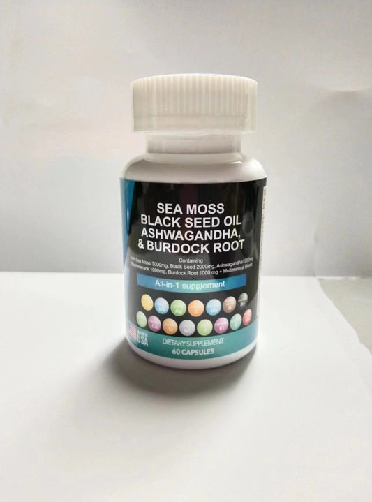 Sea Moss 3000mg Black Seed Oil 2000mg Ashwagandha 999mg Turmeric 999mg Bladderwrack 999mg Burdock 999mg & Vitamin C & D3 With Elderberry Manuka Dandelion Yellow Dock Iodine Chlorophyll ACV